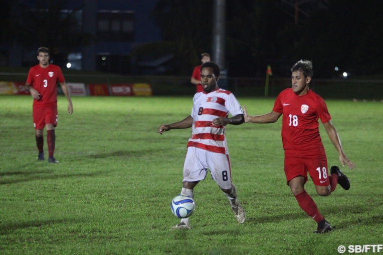 Peu avant le début du match, qui a commencé à 19H, une grosse averse a gorgé d'eau le terrain. Malgré cela, les Cagous ont rapidement montré qu'ils étaient supérieurs aux Tahitiens en termes de circulation de ballon. Le défenseur central expérimenté Matatia Paama blessé, le jeune Rico Haring perd plusieurs fois le ballon en tentant de dribbler les attaquants Cagous. Rapidement, ils se créent une première occasion.