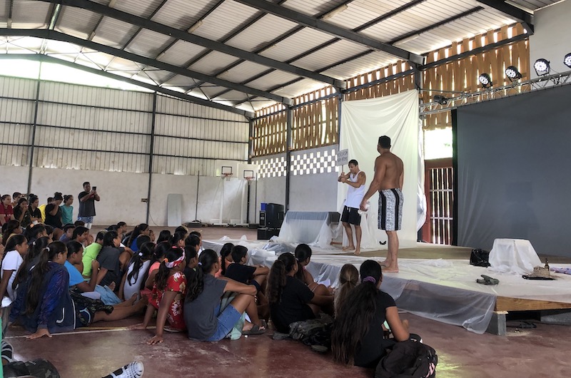 La veille, ce sont les élèves du collège Saint-Raphaël de Rikitea qui ont pu aussi assister à une représentation de la compagnie. Une première rencontre avec le monde du théâtre pour les enfants de Mangareva, comme en témoigne Katomea Angia, une élève de 3e : “C’est la première fois que j’assiste à une pièce de théâtre et j’ai été impressionnée par le jeux des acteurs… De pouvoir faire rire, partager sa colère aussi facilement, ça m’a surprise.”