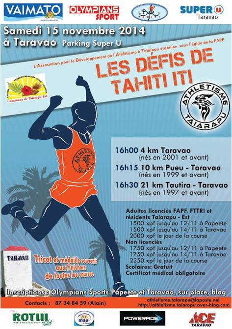 L'Association pour le Développement de l'Athlétisme à Taiarapu organise sous l'égide de la FAPF, LES DEFIS DE TAHITI ITI le samedi 15 novembre 2014 à Taravao (Parking Super U).