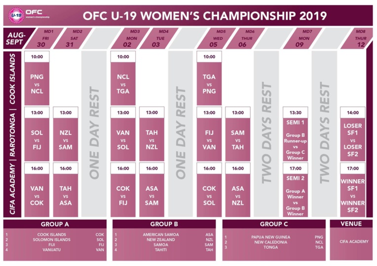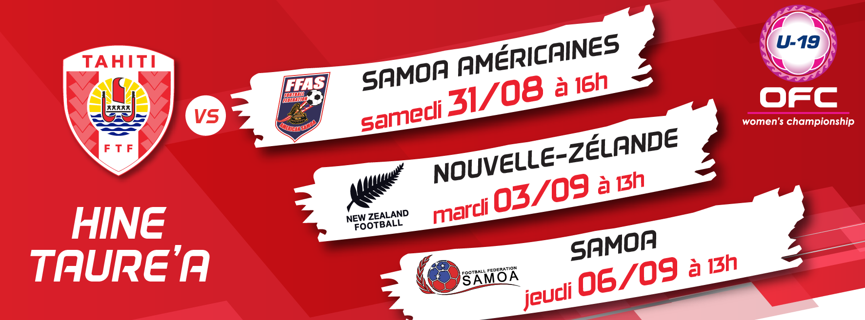 La sélection de Tahiti U19 (Hine Taure’a) menée par Stéphanie Spielmann, chargée de mission football féminin à la FTF, est aux îles Cook pour le championnat d’Océanie de football U19 du 30 août au 12 septembre. Le gagnant de la compétition sera qualifié pour la prochaine Coupe du monde féminine U20. La sélection néozélandaise, médaillée de bronze lors de la dernière Coupe du monde U17, est la grande favorite de la compétition.