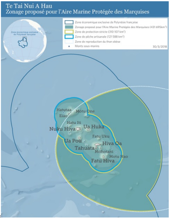 - Une zone de protection stricte de 310 000 km², entre 50 milles et 200 milles marins au sud-est de l’archipel (44% de la ZEE des Marquises). Elle inclut la zone de reproduction du thon obèse (une espèce menacée dans tout le Pacifique sauf aux Marquises). Toute pêche ou autres extractions y seraient interdites pour permettre la reproduction de ces espèces pélagiques. Le transit des bateaux resterait autorisé.