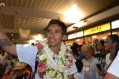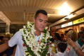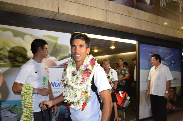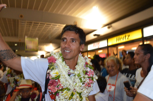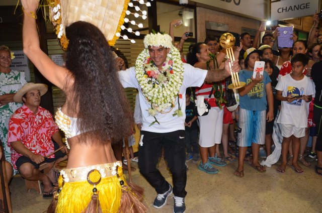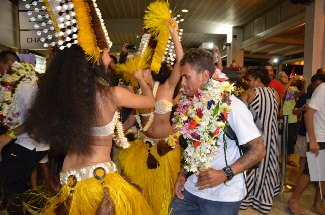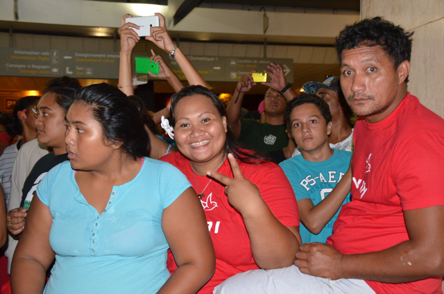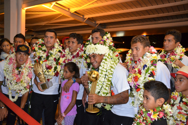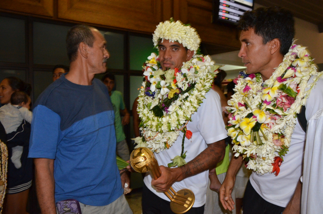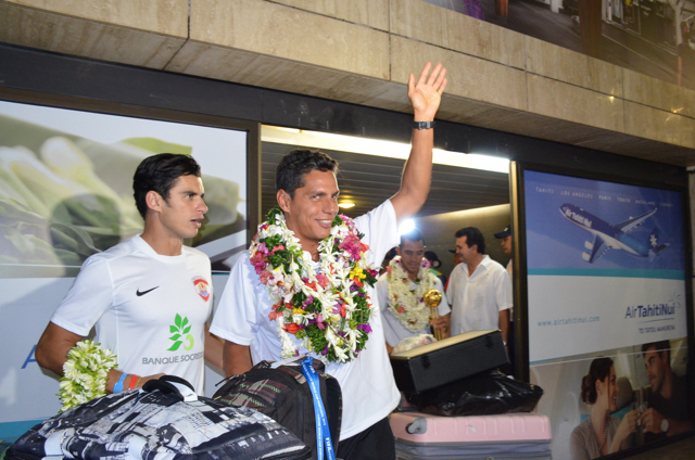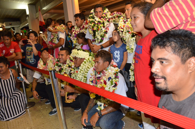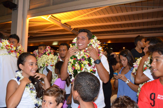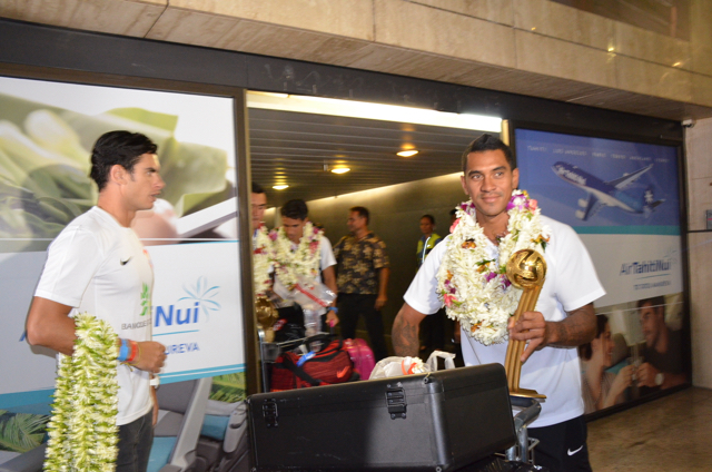 A la sortie du hall d’arrivée de l’aéroport Naea Bennett apparaît. Le capitaine de l’équipe est acclamé par les supporteurs de l’équipe de Beachsoccer. Depuis une heure, petits et grands attendent leurs favoris. Enfin, ils rentrent au fenua au son des percussions et aux parfums des fleurs de Tiaré. « Nous sommes heureux », répètent les joueurs, un peu sonnés par tant d’effervescence autour d’eux.