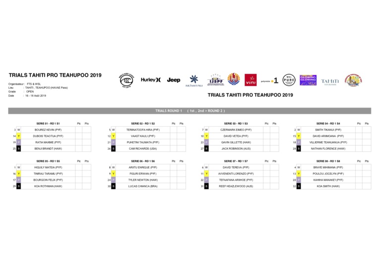 PAPEETE, le 15 août 2019 - Après concertation, la Fédération Tahitienne de Surf vous informe que les TRIALS de la TAHITI PRO TEAHUPOO 2019 se tiendront le samedi 17 août 2019. Depuis le plan d'eau de la passe de Hava'e, vers 7h, nous tiendrons un « orero » suivi d'une prière avec un hommage à notre regretté Edouard Chaves, notre beach marshall depuis près de 20 ans, avant le démarrage de la compétition à 7h30.