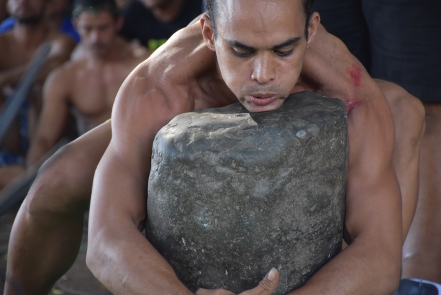 Samedi pour les hommes, le concours de lever de pierre s’est déroulé en trois séries, avec à soulever des pièces de 80 kilos, 104 kg et 120 kg.