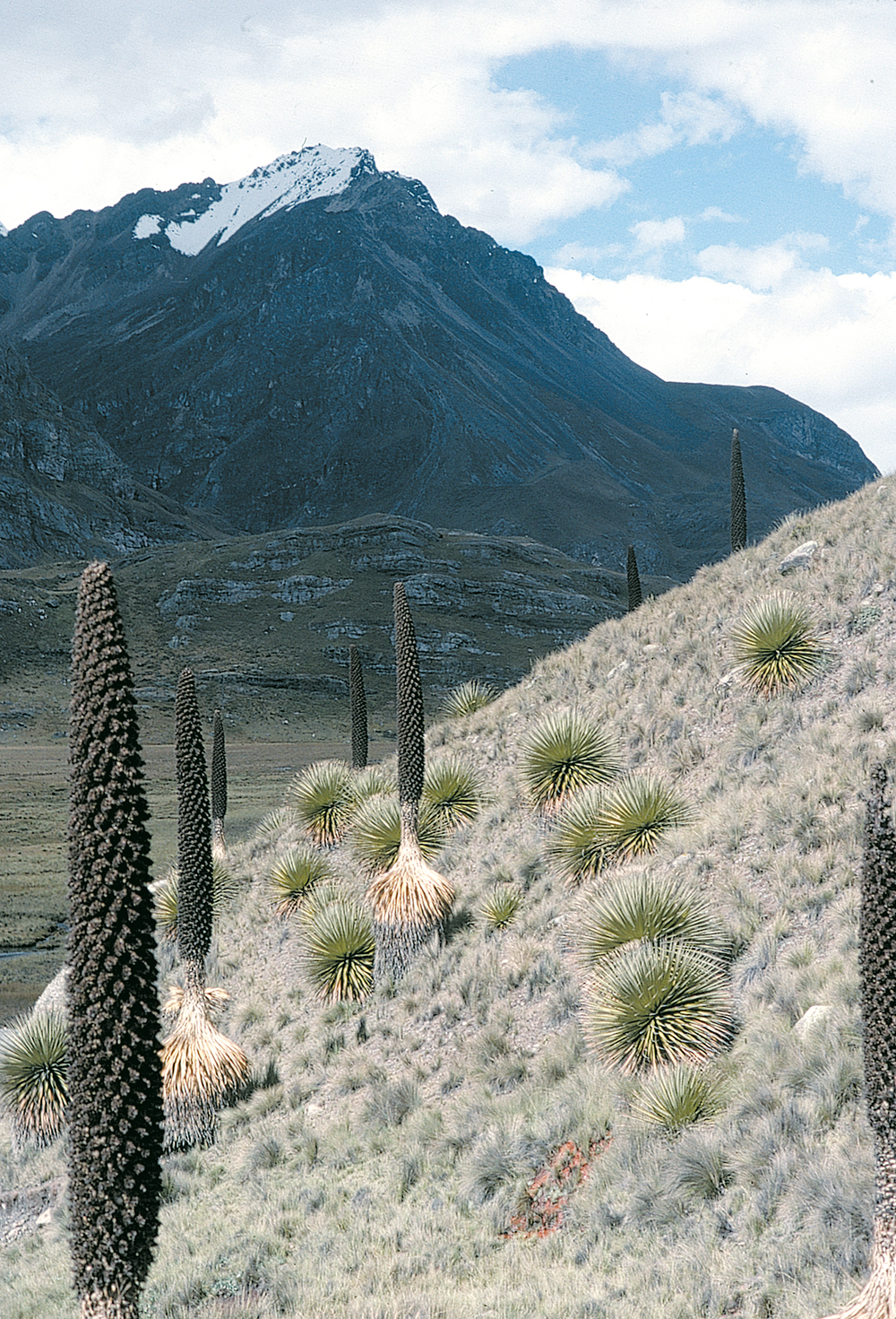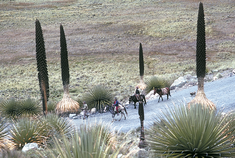 C’est à un savant et explorateur italien du XIXe siècle, le docteur Raimondi, que l’on doit la découverte de ces plantes stupéfiantes. Avec ce qui correspondrait chez nous au cœur de l’ananas, les Indiens confectionnent depuis des siècles des tabourets et des chaises sculptés dans la masse (des poteaux avec la partie haute). Aujourd’hui, l’espèce est l’une des plus menacées de la planète. Protégées dans le parc du Huascaran, où ces photos ont été prises, les grandes puyas sont encore de nos jours braconnées par des bûcherons sans scrupules. Tant que les habitants des régions où elles poussent n’auront pas compris que de belles puyas vivantes valent mille fois plus, en matière d’argent et de tourisme, que ce que rapportent les quelques coups de hache qu’il faut pour les détruire, la menace qui pèse sur elles ne se dissipera pas.