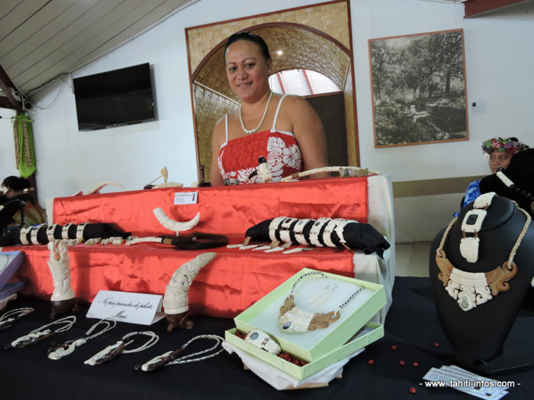 A quelques mères de là, le sculpteur marquisien Marc Barsinas a installé son stand. Originaire de Tahuata, l'artisan n'a pas pu faire le déplacement mais il a envoyé toutes ses pièces à sa belle-sœur. "Nous avons ici beaucoup de choses différentes, décrit Augustine Teriimana. Il y a des colliers marquisiens, en os de bœuf, en to'u et en bois de santal. Nous avons aussi des lances avec de la nacre incrustée ou encore des bracelets et des pipes… " Selon cette dernière, chaque pièce est unique. Le salon de l'art du fenua leur permet de mettre en avant ce savoir-faire des Marquises.
