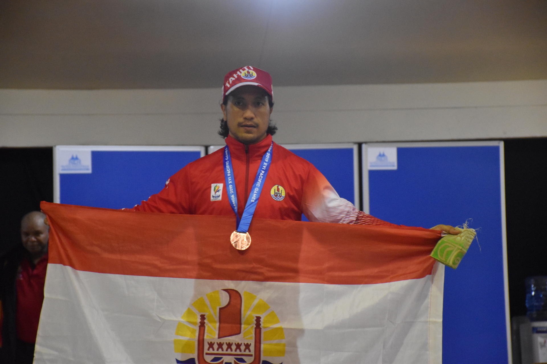 Le match pour le bronze a été difficile, il y a eu du combat avec mon adversaire fidjien. On se rendait coup pour coup. Je ne sais pas exactement ce qui a fait la différence, mais les encouragements de toute l'équipe m'ont beaucoup aidé pendant le match. Et j'ai pensé aussi à ma famille. Ça m'a donné encore plus envie de me battre et de dérocher la médaille. Cette médaille de bronze c'est la délivrance pour moi. Je suis content de ma performance et cette médaille est pour Tahiti.