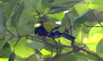 Sinon, au niveau des monarques, la saison de reproduction bat son plein : pas moins de 13 nids sont en activité ce mois d'octobre 2014, et nous avons déjà notre premier poussin au nid au fond de Papehue. Si Poea et Manuarii, le couple de la cascade qui l’élève, sont bien sages et ensemble depuis des années, le couple du camp d'à côté, au tout début de la vallée, est un rien perturbé : une nouvelle femelle (baguée bleue, elle n’a pas encore de nom car elle n’est pas encore parrainée) s’est établie sur le territoire ‘Faifai’ d’à côté.