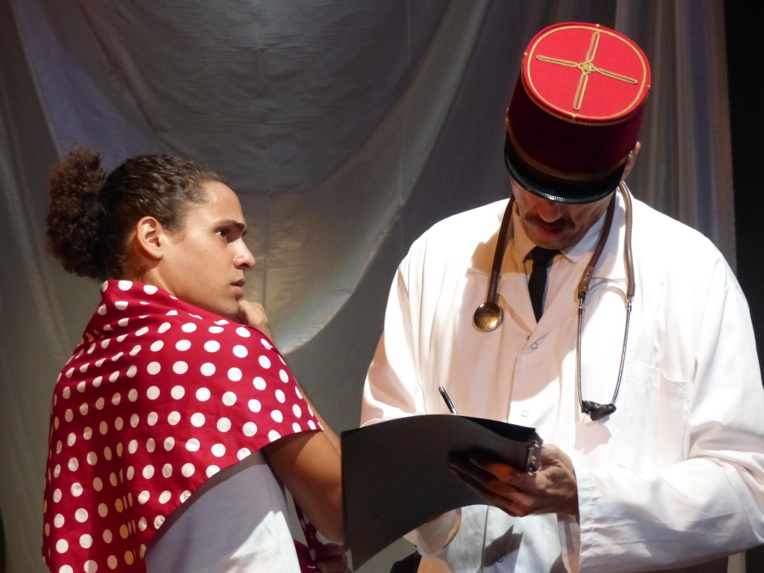 De talentueux comédiens (ici Tuarii Tracqui et Guillaume Gay) du fenua portent cette pièce de théâtre traitant du sujet explosif des essais nucléaires menés en Polynésie.