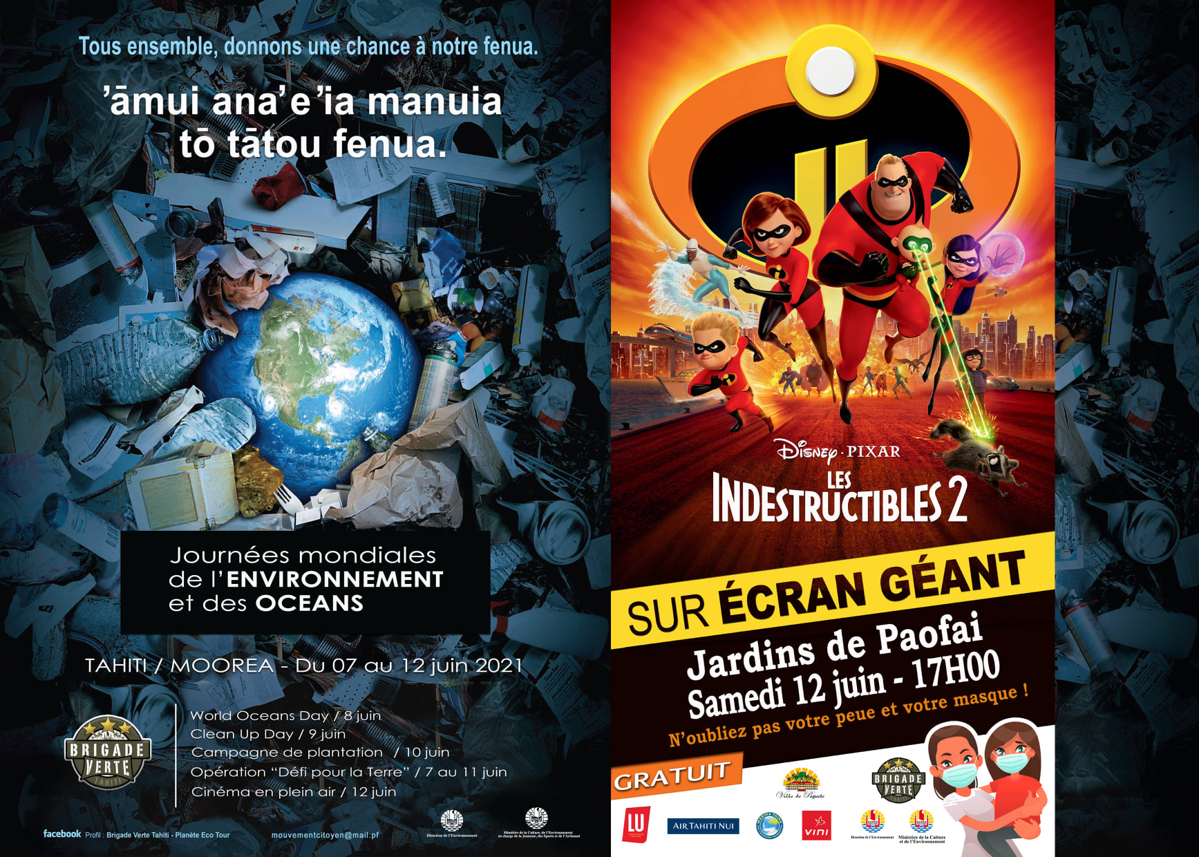 Cette semaine, dans le cadre de la journée mondiale des océans, la Brigade Verte a un programme chargé. Elle te donne rendez-vous samedi au parc Paofai à partir de 17 heures pour (re)découvrir le dessin-animé les Indestructibles 2. C’est gratuit ! Il y aura en plus des animations dès 16 heures, dont Mata Tohora.