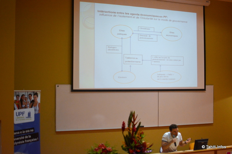 C'est un exercice périlleux que de résumer quatre ans de recherches économique en quelques lignes. Dans sa présentation, Jean-François Gay commencer par démontrer comment le protectionnisme économique impacte négativement la productivité, les prix et l'emploi des petites économies insulaires (dont la Polynésie française). Le futur économiste s'attarde ensuite sur les raisons qui permettent à ce système de perdurer.