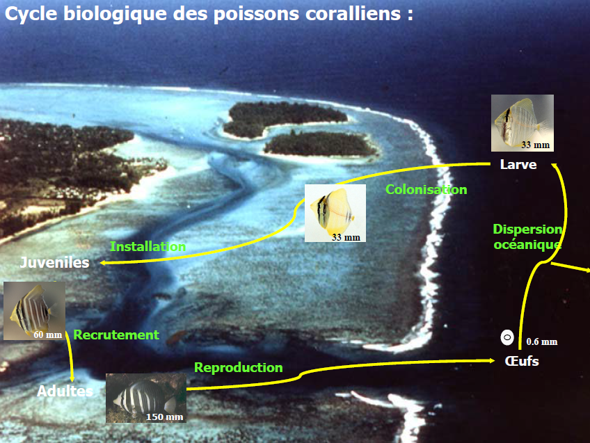 Les poissons vivant dans les récifs coralliens ont généralement un cycle de vie complexe avec une phase larvaire océanique de quelques jours à quelques mois, suivie d’une phase récifale relativement sédentaire pour les juvéniles et les adultes. Dans les heures qui suivent ce retour dans les récifs, les larves se métamorphosent et doivent rechercher un nouvel habitat adapté au stade juvénile de l’organisme (phase de recrutement). Il est aujourd’hui largement admis que la taille des populations de poissons adultes est déterminée principalement par le succès de cette phase de recrutement. Ce succès se caractérise par la recherche d’un habitat de vie favorable et par la fuite en présence de prédateurs. Ainsi, selon les espèces, le taux de survie des larves pendant cette phase (qui peut durer 4-6 jours) varie de 10 à 40%. Cependant, ce succès du recrutement, donc le taux élevé de survie des larves, peut fortement diminuer selon l’état de dégradation des habitats coralliens et la pollution soit par des pesticides soit par des microplastiques pouvant affecter les capacités cognitives des jeunes poissons. L'étude du Criobe a démontré la perte de la mémoire des larves de poissons dans un récif corallien pollué par des pesticides. Cette perte de la mémoire expose davantage les larves de poissons aux différents prédateurs présents dans les récifs, augmentant le taux de mortalité des larves lors du recrutement. Si moins de larves sont capables de recruter dans les récifs, alors l’homme aura moins de poissons adultes à pêcher pour sa subsistance.