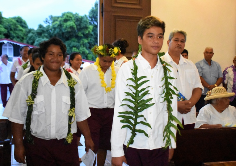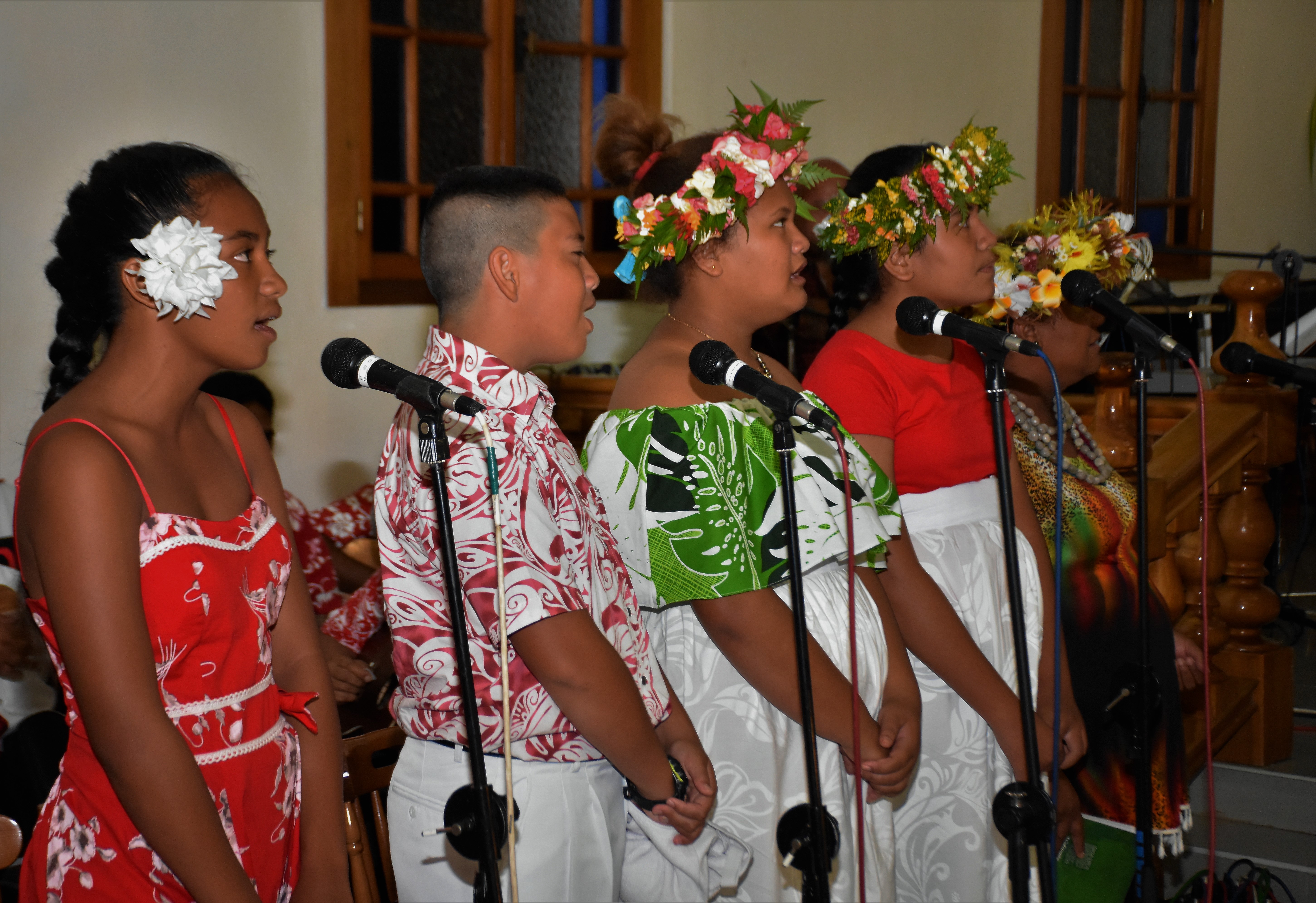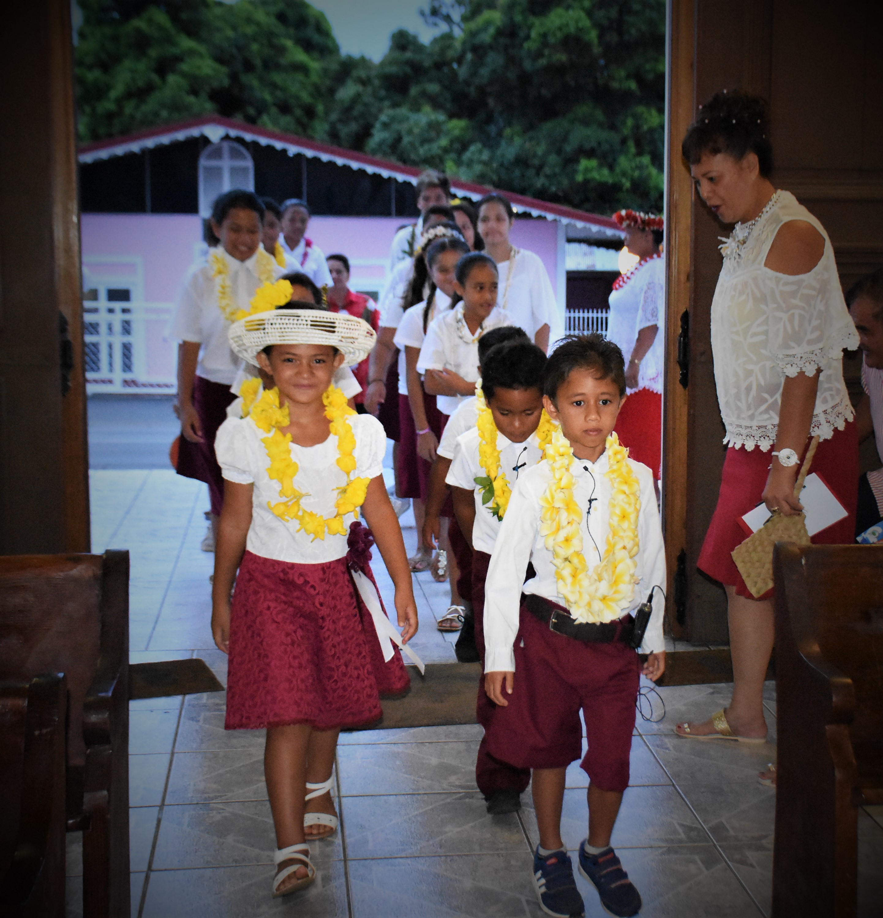 Avec leurs hauts blancs et leurs jupes et pantalons grenat, une vingtaine d'enfants ont animé, lundi soir, le culte du réveillon de Noël, à Mahina.