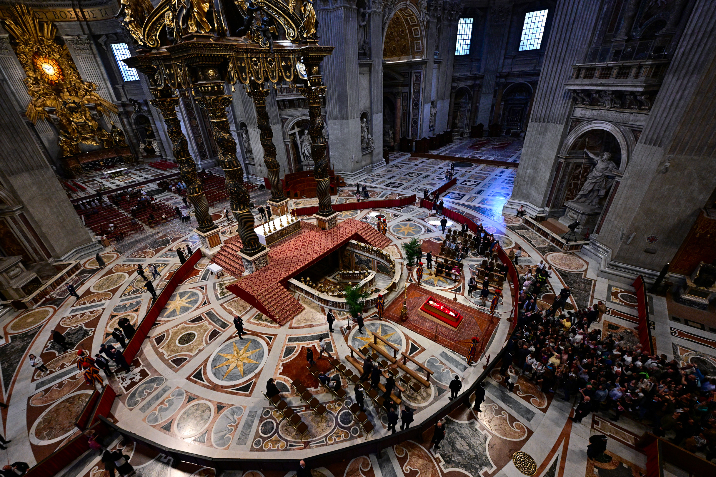Après avoir parcouru l'allée centrale de la basilique, le cercueil ouvert en bois clair, capitonné de rouge, a été installé devant le maître-autel de la basilique, lui-même surmonté du monumental baldaquin en bronze du Bernin, chef-d'œuvre de l'art baroque tout juste restauré.