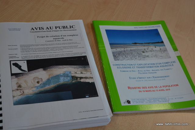 Le dossier de l'étude d'impact sur l'environnement du complexe aquacole de Hao et le registre pour y noter commentaires et questions, est disponible jusqu'au 15 avril au service de l'urbanisme, à la direction des affaires foncières, à la direction des affaires marines et à la direction de l'environnement. La consultation est publique.
