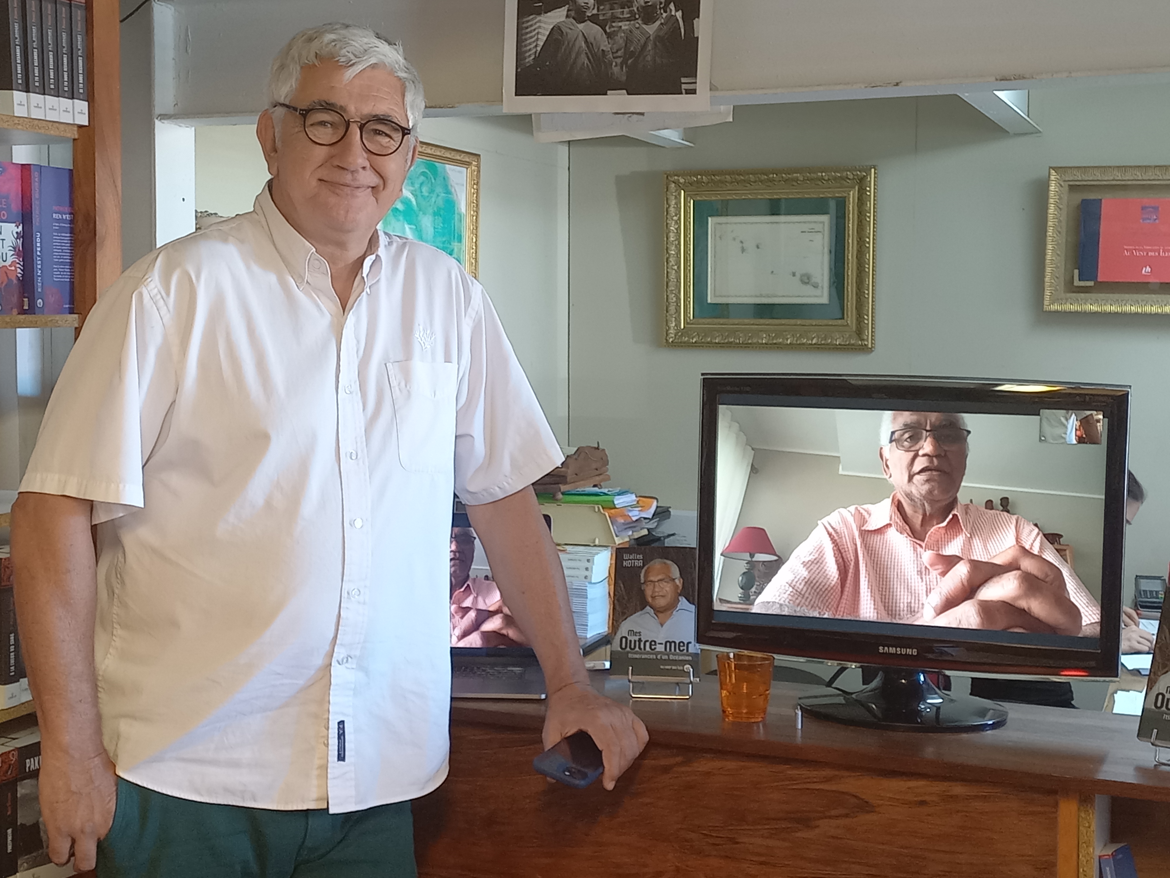 L’éditeur Christian Robert et Walles Kotra, l’auteur en direct de Nouvelle-Calédonie où il réside, lors de la conférence de presse ce mercredi.