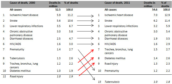 La tuberculose est la seule cause de mortalité à être sortie du top 10 de l'OMS entre 2000 et 2011, permettant à une nouvelle cause de mortalité -- les accidents de la route -- d'entrer à la 9e place.