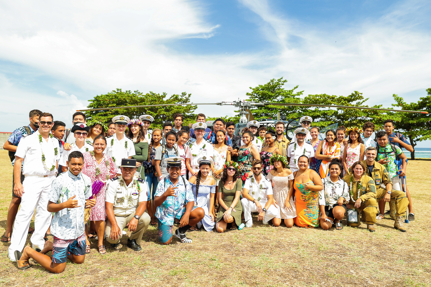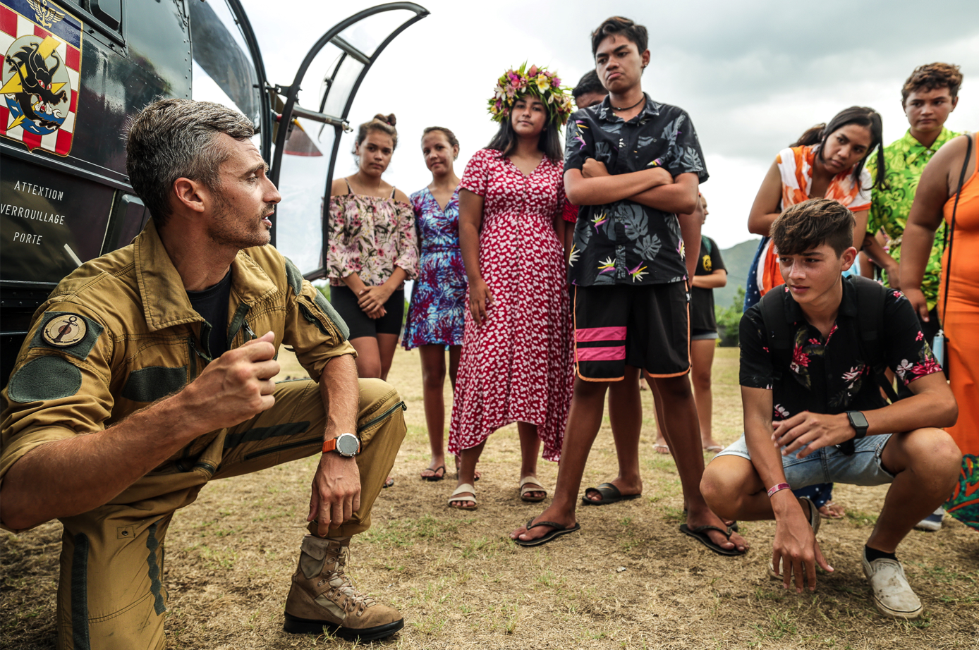 Après avoir déjeuné en compagnie de la délégation de la frégate, les collégiens se sont rendus sur le stade Tavana Reia pour assister à l'arrivée de l'Alouette III, un hélicoptère basé sur la frégate, entamant sa dernière année, et du commandant du Prairial, Alban Doulcet. "Mon rôle est de leur faire comprendre ce que l'on fait dans la marine en Polynésie française", explique le commandant. "Le fait d'arriver en hélicoptère est une manière de leur montrer quelque chose de concret. On est très heureux de pouvoir renouer le contact avec les jeunes aujourd'hui en les initiant de nouveau au monde de la défense".