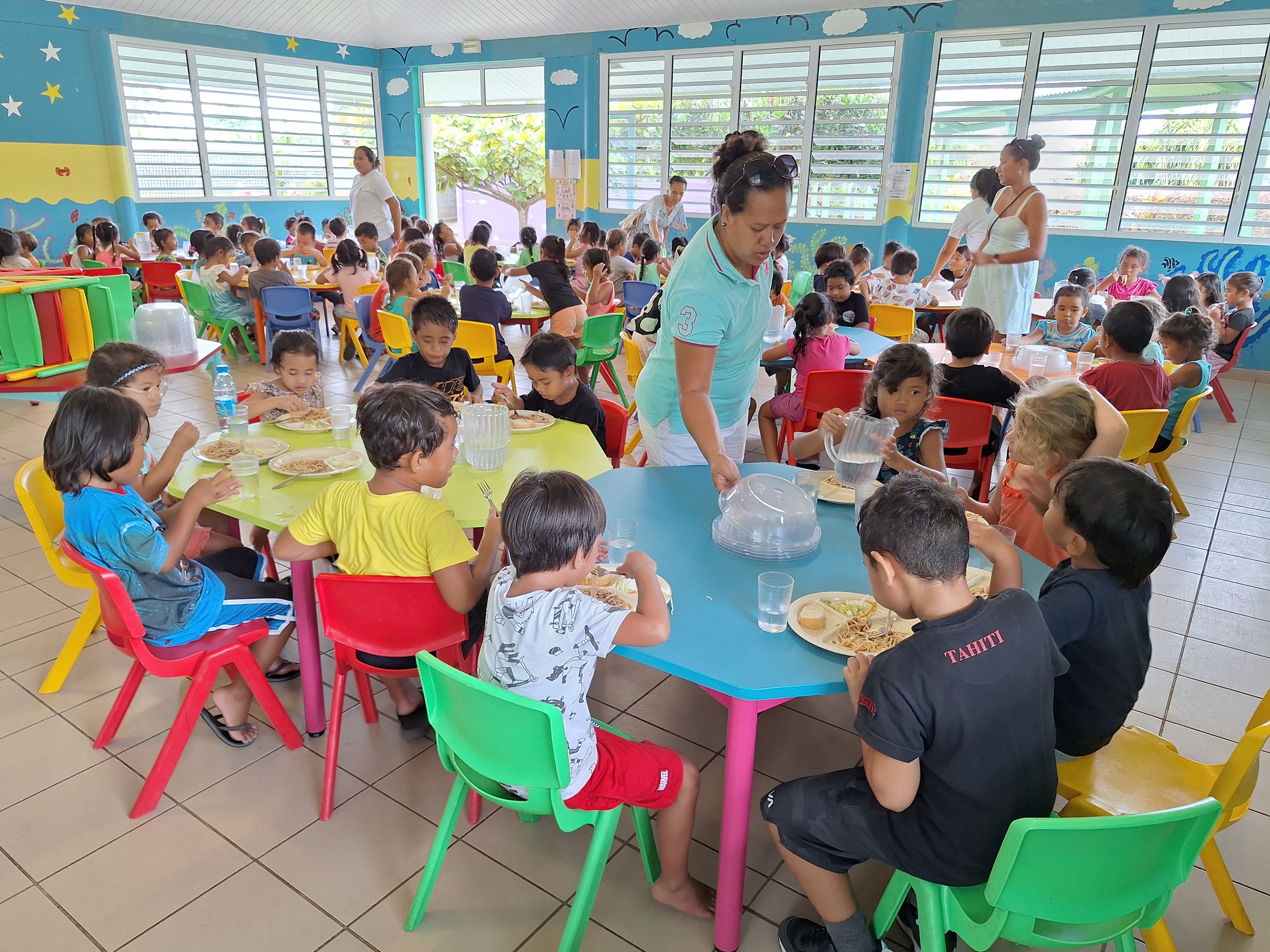 Chaque jour, ce sont environ 1.300 repas qui sont préparés et servis dans les cantines des dix établissements scolaires du premier degré de Paea. Un service qui se prépare bien en amont, de l’élaboration des plats à la livraison par la cuisine centrale, sans oublier la mise en place dans chaque réfectoire. Ce lundi, à l’école maternelle Vaiterupe, 89 enfants étaient attendus pour le déjeuner, à 11h30, ainsi que quelques parents, conviés par la commune dans le cadre de la deuxième édition des journées porte-ouverte de la restauration scolaire.