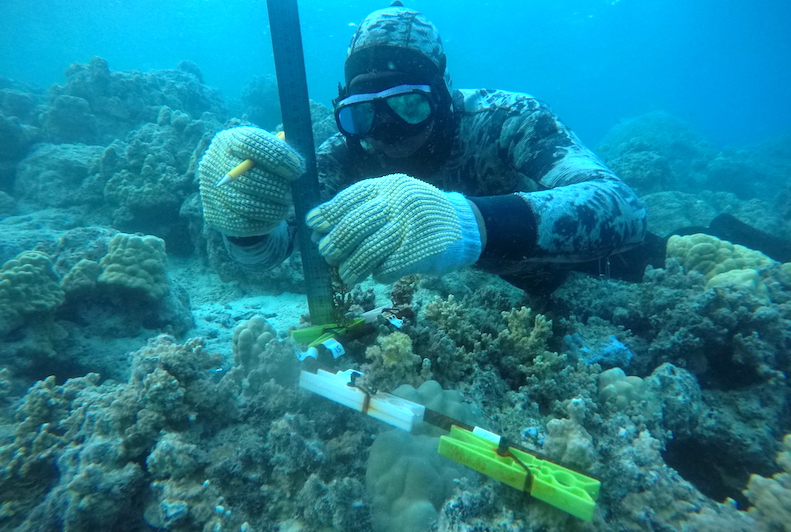 Une équipe de scientifiques mène des recherches sur les poissons herbivores, en collaboration avec des pêcheurs de Moorea. ©Recodem