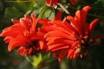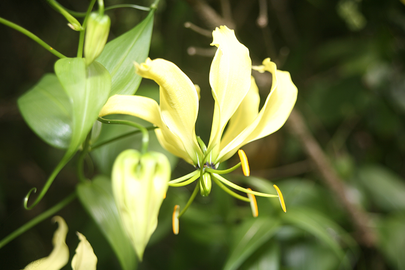 L’inflorescence de cette plante est généralement rouge, mais il en existe (notre photo) des variétés jaunes, très élégantes. Attention à ne jamais ingérer quelque partie que ce soit de ce lis de Malabar, car toutes les parties de la plante sont toxiques et peuvent même être mortelles (les rhizomes notamment). Gloriosa superba contient en effet un alcaloïde aussi redoutable que redouté, la colchicine que l’on retrouve en pays tempéré dans les colchiques.