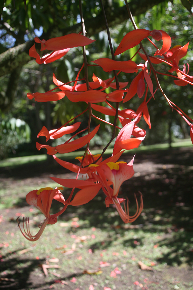 Très répandu dans l’archipel des Australes, l’arbre à baleine est ainsi appelé car le début de la floraison coïncide avec le retour des grandes jubartes, les baleines à bosse. Attention, toutes les parties de l’arbre, y compris ses fleurs vermillon vif, sont toxiques : elles contiennent des glycosides cyanogènes, de saponines et des alcaloïdes mortels à des doses faibles. Les graines contenues dans les gousses sont évidemment toxiques lorsqu’elles sont crues. Il est admis qu’après cuisson, elles sont comestibles, mais il faudrait être bien téméraire ou affamé pour se risquer à en manger.