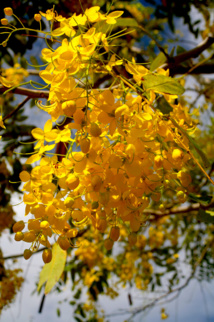 Lorsque Cassia fistula est en fleur (décembre chez nous), l’arbre disparaît sous une avalanche de fleurs jaunes. Les fruits, de longues capsules, renferment une pulpe qui serait comestible (prudence...), en revanche, les graines, elles, sont toxiques et redoutablement dangereuses, les intoxications qu’elles provoquent en cas d’ingestion ne se limitant pas à de simples troubles intestinaux.