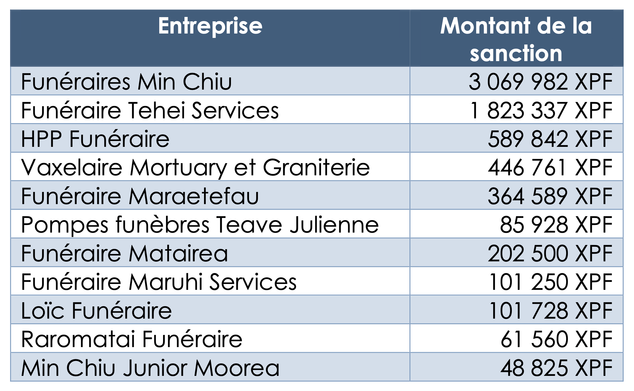 Néanmoins, l'APC dit avoir pris en compte la “gravité particulière de l'infraction mise en œuvre pendant la crise sanitaire” puisque cette entente s'est faite “au détriment direct des familles endeuillées et indirect de la CPS”. Les sanctions ont donc représenté entre 0,4 et 2,3% du chiffre d'affaires annuel des entreprises concernées pour un total de 6 millions de Fcfp d'amende dont la moitié est déjà captée par Min Chiu et près d'un tiers par Tehei Services.