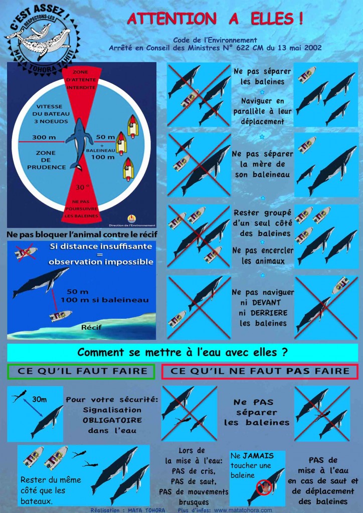 Sur son site, Mata Tohora précise : "N’oublions pas qu’elles viennent de parcourir des milliers de kilomètres. Certaines d’entre elles vont mettre bas dans quelques semaines et d’autres sont encore toutes jeunes et réalisent pour certaines leur premier retour, parcours d’une grande migration… Les baleines à bosse adultes et juvéniles ne se nourrissent pas en Polynésie, faute de quantité de krill (petites crevettes) suffisante. Elles perdent jusqu’à un tiers de leur poids soit environ 10 tonnes. Provoquer des déplacements vers le large en les dérangeant induit une consommation énergétique inutile et les place face aux prédateurs du baleineau…" Rappelons que la Polynésie est l'un des plus grands sanctuaires au monde pour les cétacés depuis 2002, avec une surface océanique de 5 millions de kilomètres carrés et 21 espèces de baleines et de dauphins, ce qui caractérise une diversité biologique élevée. Le harcèlement, la capture et la chasse sont strictement interdits. Ainsi, les règles d’approche dictées par le Code de l’Environnement sont à connaître absolument avant de sortir en mer (voir encadré).