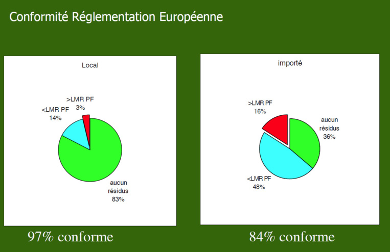 Ainsi sur les 115 produits locaux, 99 % sont conformes à la réglementation locale et 82 % ne présentent aucun résidu. Selon la réglementation européenne, 97 % de ces fruits et légumes sont conformes.