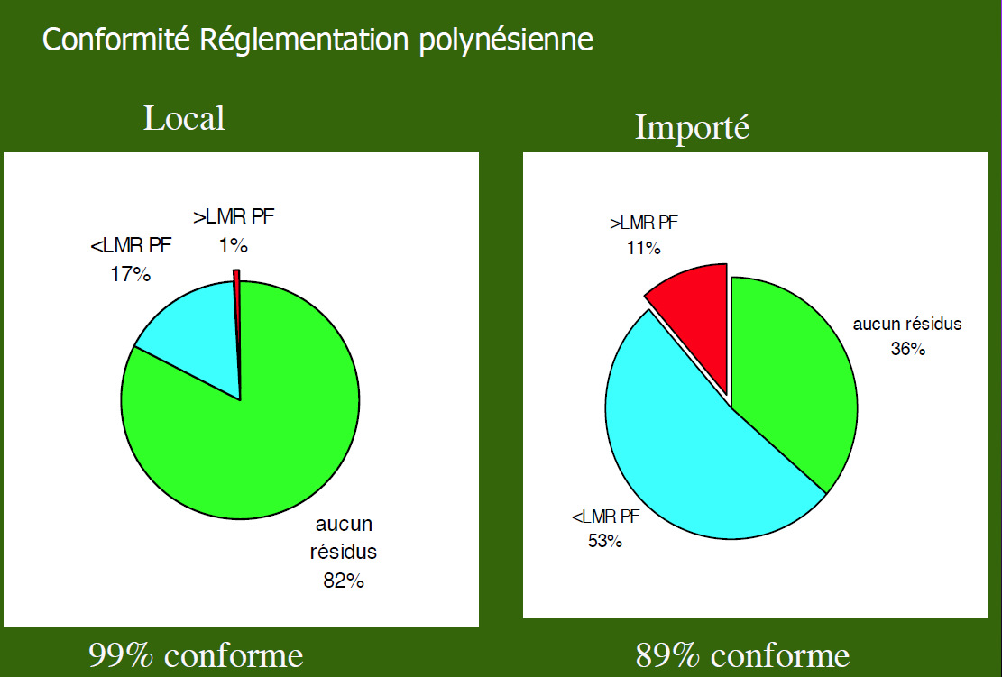 Du côté des produits importés, la chanson n'est pas la même. Ainsi selon la réglementation de conformité polynésienne, 89 % des produits sont conformes, mais seulement 36 % ne présentent aucun résidu et 3 % avec un taux LMR supérieur à la réglementation. Cette conformité passe à 84 % selon la norme européenne avec 36 % ne présentant aucun résidu et 16 % présentant un taux LMR supérieur à la réglementation européenne. Soit, plus de la moitié des fruits et légumes importés en Polynésie qui ne sont pas conformes selon la réglementation européenne.