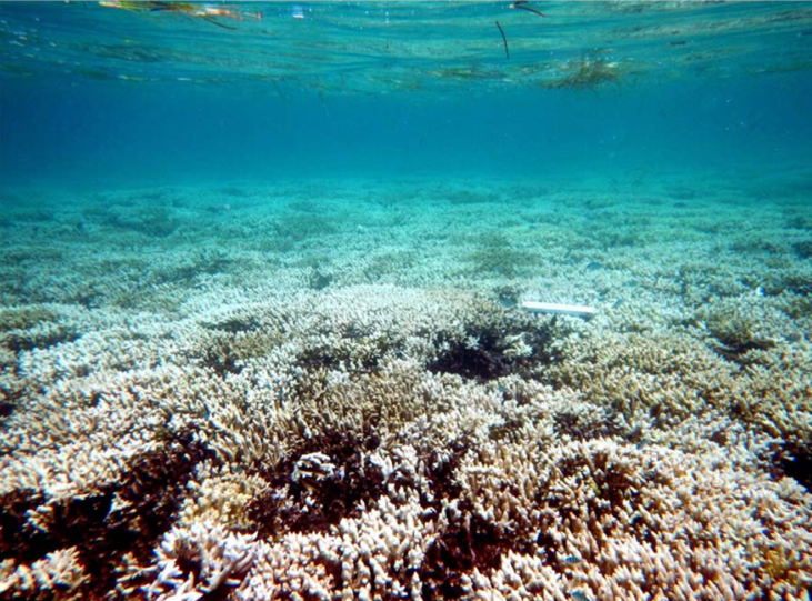 Les coraux branchus en eau peu profonde sont fortement touchés : à l’îlot Maître, les Acropora montrent un blanchissement étendu (échelle 20 cm). © IRD / F. Benzoni.