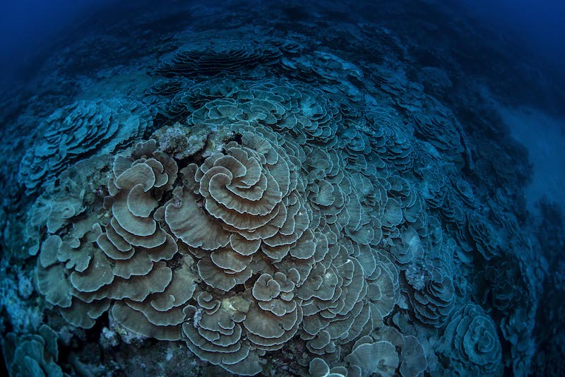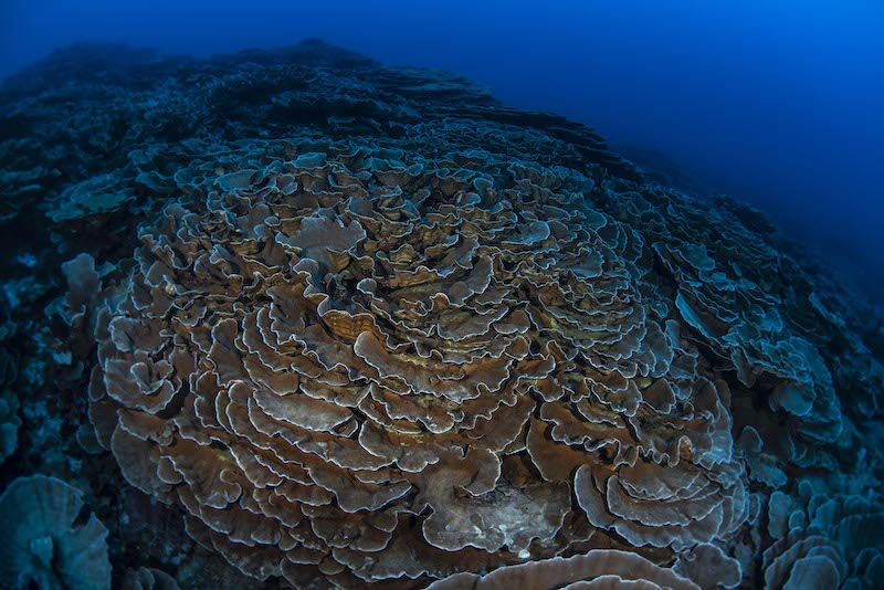 “Ah non pas du tout, en fait c'est vraiment dans la continuité du récif. En fait, vous vous mettez à l'eau, là où les vagues se cassent au niveau du récif de surface. Et vous longez la topographie du fond. Vous allez passer par un plateau et à partir de là ça continue à descendre tout doucement. Et à 30 mètres, vous avez ce champ qui s'étend devant vous. Donc, on est dans la continuité du récif corallien. Et c'est ça qui est assez intéressant parce que finalement, même nous, scientifiques, nous ne connaissons pas si bien les récifs coralliens. Nous nous sommes beaucoup attachés à étudier la zone de 0 à 20 mètres parce que c'est plus facile pour travailler, parce qu'en termes de plongée on peut y rester très longtemps. On peut développer plein de protocoles scientifiques… Et dès qu'on descend sous les 30 mètres, on ne peut pas rester longtemps, donc on ne l'a pas vraiment étudié. Mais ce qu'on pense, c'est que plus on va descendre dans ces profondeurs-là, plus on va découvrir potentiellement plein d'autres zones coralliennes du même type. Aujourd'hui j'ai envie de dire que ce site est original, parce qu'on ne connaît pas non plus finalement les récifs coralliens qui sont situés en-dessous des 30 mètres.”