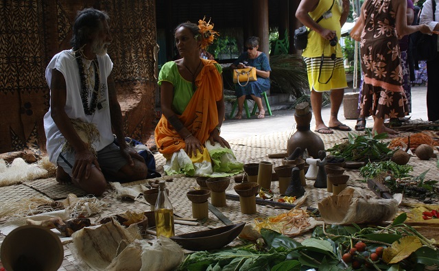 Installés dans les jardins, des membres de l'association Haururu enseignent l'utilisation des fruits et fleurs pour teindre les tapa. «En pilant les fleurs de purau et en les mélangeant avec un peu d'eau, on obtient un mauve foncé », décrit Cathy, de Haururu. « Ici, il y a des graines de miro », montre-t-elle du doigt. "En incisant les fruits et en les trempant dans l'eau, ça donne du jaune."