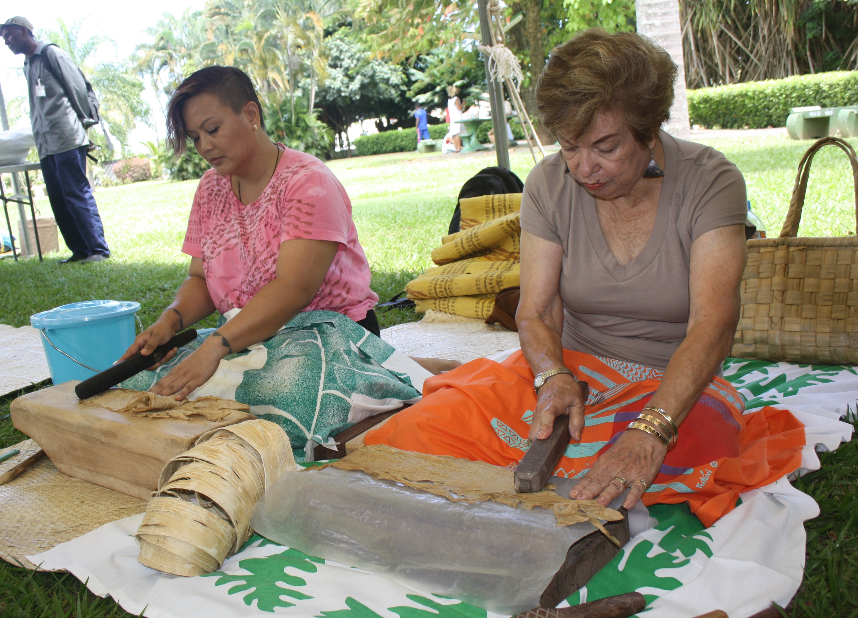 Depuis mardi, les jardins de la mairie de Pirae vibrent aux coups des battoirs sur les enclumes en bois dur. Des experts en tapa venus des quatre coins du Pacifique présentent leur mode de fabrication de l'étoffe. Le festival du tapa, lien culturel d'Océanie, a lieu jusqu'au 23 novembre.