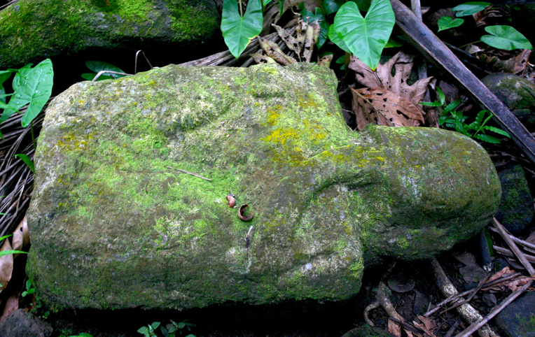 Cette sculpture impressionnante orne un ensemble lithique englouti par la forêt, le mea’e Haapaetai. Réalisée en tuf rouge, le ke’etu, elle mesure 1m 55. Elle n’est pas inconnue des spécialistes, mais complètement “oubliée”, hors des circuits touristiques.
