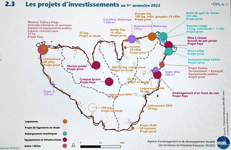 Lors de la réunion du COS, samedi, une carte des projets en cours à Moorea a été dévoilée. Au sujet de l'aménagement des différentes zones de l'île, sept sites ont été définis comme porteurs de projets, avec chacun une vocation particulière. Ainsi, la zone Temae a vocation à être centré sur le tourisme, les activités et les logements ; Vaiare et sa gare maritime en espace d’accueil à développer ; Paopao comme zone d’activités et de logements ; Papetoai en zone agricole, aquacole, avec un fort accès environnemental et des espaces pour la pêche lagonaire ; Tiahura en zone de tourisme et de loisirs ; Afareaitu en centre en centre administratif ; et enfin Maharepa, très touristique et urbanisé, en zone de développement d’activités commerciales. À propos de Temae, le ministre de l'Aménagement, Jean-Christophe Bouissou, a confirmé qu'“il n’y aura pas d’extension d’un hôtel sur le lagon”.