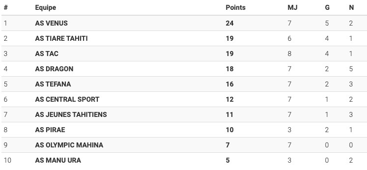 La huitième journée du championnat de Ligue 1 s’est déroulée ce week-end. Quatre rencontres sur cinq se sont soldées par un match nul : Tiare Tahiti-Dragon (2-2), Vénus-Tefana (1-1), Central-JT (1-1) et Taravao-Manu Ura (1-1). Pirae a battu l’Olympique de Mahina 11-1. Au niveau du classement, aucun changement.