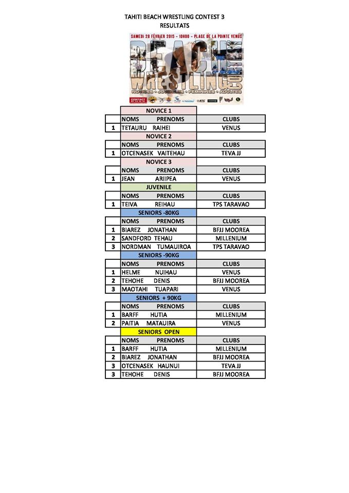 Hutia Barff du Team Millenium, que l’on voit évoluer en jiu jitsu brésilien et surtout en judo, s’impose dans sa catégorie des + de 90 kg, Nuihau Helme du Venus Judo gagne en – de 90 kg et le lutteur sélectionné pour les Océania de lutte prévus aux îles Marshall le 20-22 mars, Jonathan Biarez de BFJJ Moorea, fait une forte impression pour sa première participation puisqu’il réussit à battre Tumaui Nordman et Tehau Sanford pour s’imposer dans la catégorie – de 80 kg.