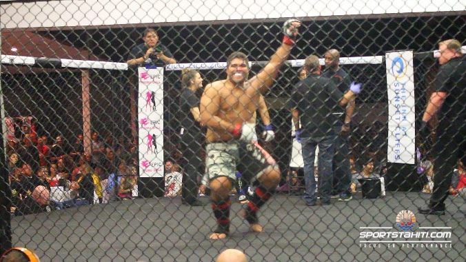 Et enfin c’est notre Huahine boy qui a clôturé la soirée côté tahitien en proposant un combat très engagé face à Steven Schraeel. Un duel qui a démarré sur les chapeaux de roues à travers des échanges de coups debout, au sol et contre la cage. Sur le côté, nous avons pu entendre les commentaires explosifs du consultant sportif Christ Lebel, ancienne star de l’UFC, qui a été épaté par la combativité de Tamahau McComb. Notre combattant des Raromata’i a su prendre l’avantage les deux premiers rounds mais dans la troisième reprise Tamahau a été victime d’une baisse de régime. Dans la dernière minute, Steven Schraeel à su faire la différence sur un ground and pound (frappes au sol). L’arbitre a préféré arrêter le combat. Notre tahitien n’a pas démérité, son opposant lui a confié qu’il n’avait jamais vécu un combat aussi difficile. Tamatoa Tefau / Sport Tahiti