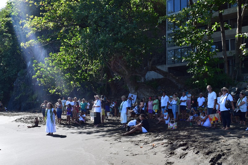 La population de la côte, et plus particulièrement celle de Arue, était d’abord invitée à se rassembler au complexe sportif Boris-Léontieff à 8 heures. De là, une trentaine de voitures s’est organisée en convoi, mené par un petit orchestre, afin de rejoindre en file indienne le site du Tahara’a. La maire de la commune, Teura Iriti, son troisième adjoint Jacky Bryant mais également le député nouvellement élu Steve Chailloux, figuraient parmi les participants, pour la plupart vêtus de blanc.