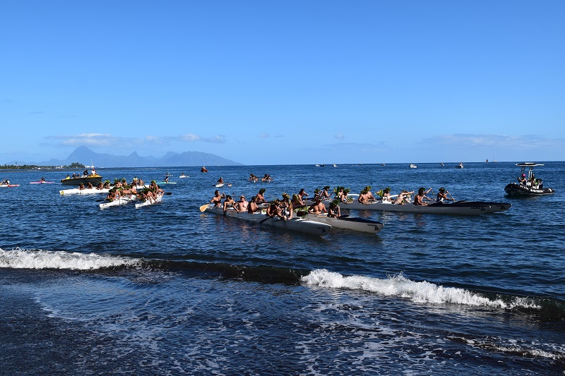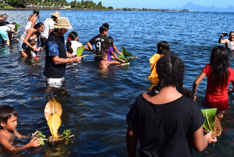 Et la terre étant toujours reliée à la mer dans la tradition polynésienne, une seconde cérémonie a ensuite été organisée en bas du promontoire, sur la plage de la baie ‘Ati-tautu-mua. Près de 150 personnes s’étaient réunies pour accueillir le convoi des pêcheurs et piroguiers venus par l’océan. Un atelier de confection de tītīrāina a permis aux enfants de fabriquer des petits jouets en forme de pirogues, avant de les déposer sur l’eau. “Ce jeu qui se destine aux plus jeunes permet de les initier au milieu marin, à la navigation, en apprenant à connaître le sens du vent, l’orientation des vagues… C’est une manière de se réapproprier la mer et de rappeler que cet endroit est un lieu de pêche et de plongée prisé. Alors y rejeter de l’eau qui n’a été traitée que partiellement, c’est détruire ce que nous avons de plus cher”, poursuit l’ancien ministre de l’Environnement, qui dénonce le rejet en mer des eaux usées du New Tahara’a, dont seulement une petite moitié devrait être traitée en amont.