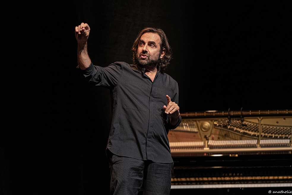 “En réalité, c’est un one-man-show sur l’histoire de la musique, avec des histoires vraies de musiciens, racontées à travers mon expérience. Dans un premier temps, je raconte mon amour du jazz, […] et surtout je raconte que tous les musiciens classiques et grands compositeurs dont on étudie les œuvres dans les conservatoires, savaient tous improviser, tels que Mozart, Beethoven, Bach, Haydn… Il y avait des battle entre eux, à l’exemple de Mozart versus Clementi. On n’a pas attendu Booba et Kaaris pour faire des battle. […] Je dis ‘conférence pianotée’ car il y a des preuves à l’appui, avec le piano. J’adore expliquer la musique d’une manière drôle. Lorsque vous la jouez, les gens comprennent même s’ils ne sont pas du tout initiés. […] Chanter c’est plus que se mettre à nu, c’est dévoiler son âme. En réalité c’est un striptease spirituel. Pour le troisième volet, je parle de la musique en Orient puisque c’est l’héritage que j’ai eu de mes parents Arméniens. Toujours au piano, je démontre la différence en Orient et en Occident. […] On va donc finir sur une note de tendresse et de nostalgie. Ce spectacle est un voyage dans lequel j’emmène les spectateurs, une sorte d’initiation à la musique à travers l’humour, la sensibilité et les émotions, pour finir sur une touche d’Orient.”