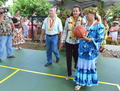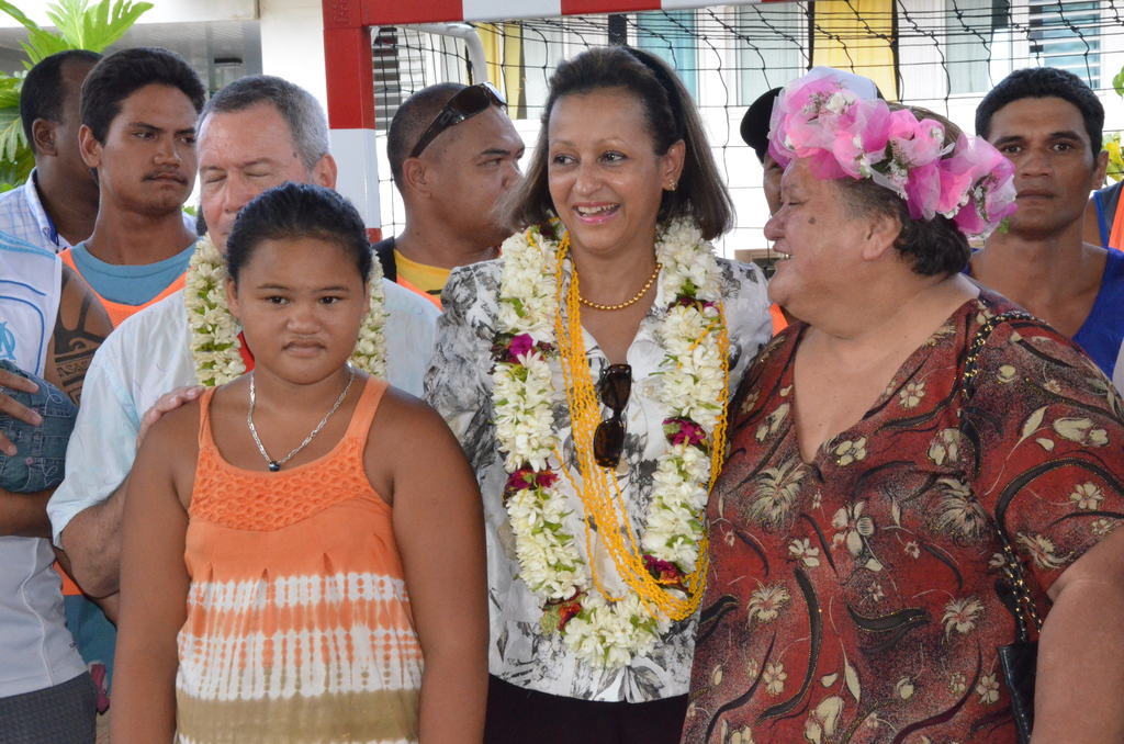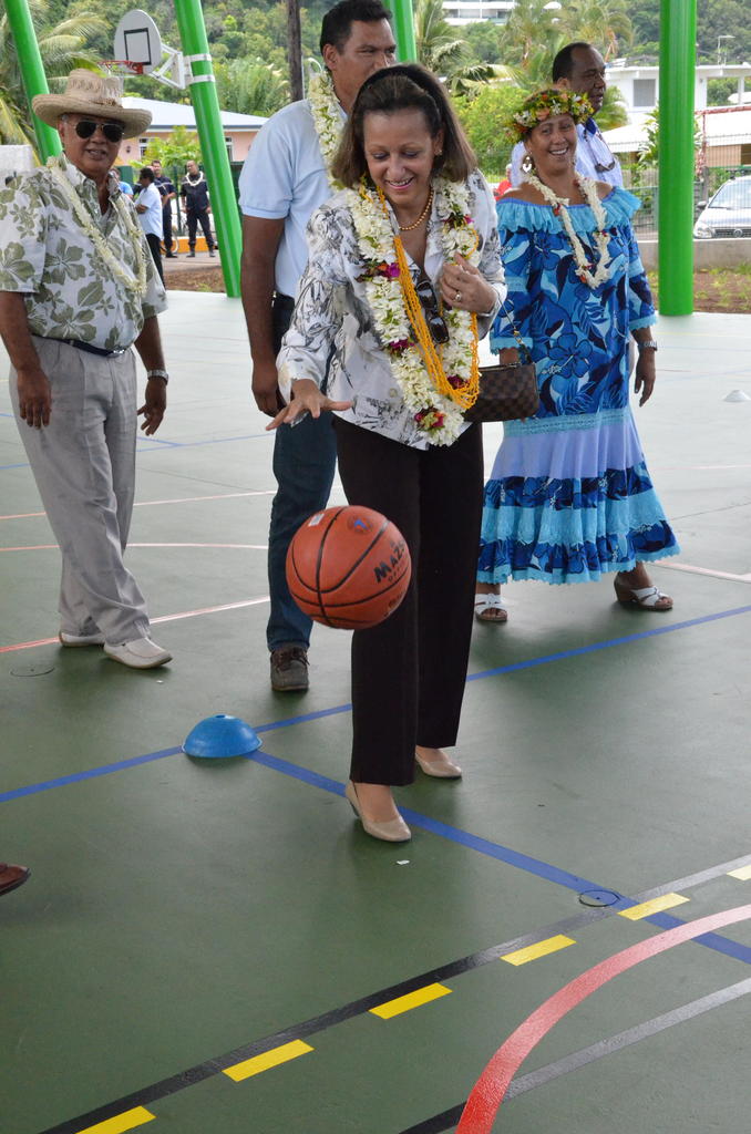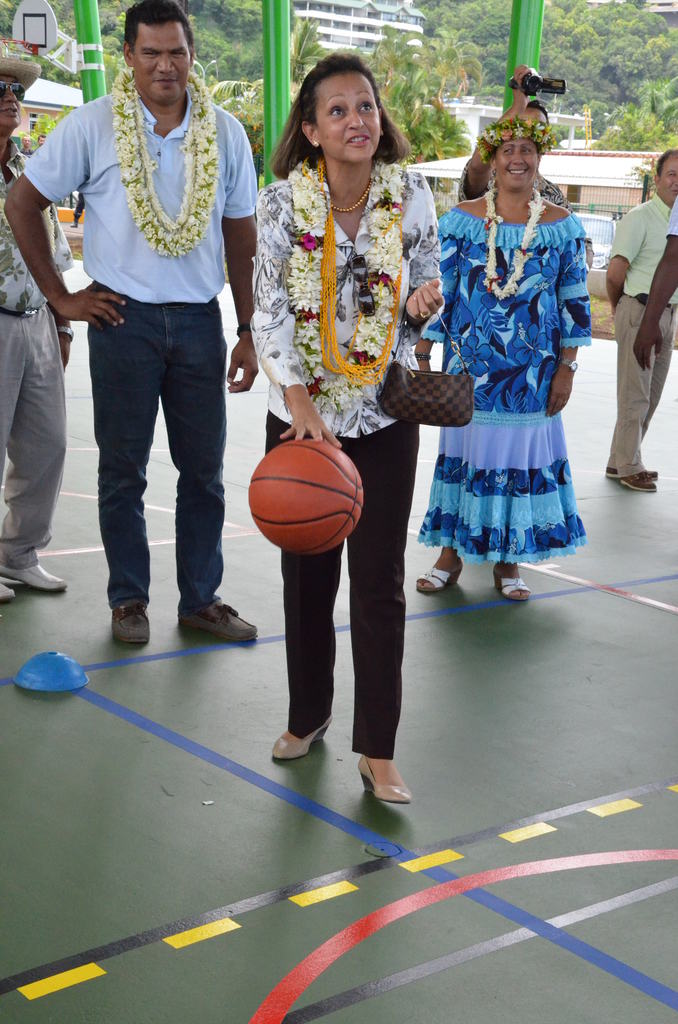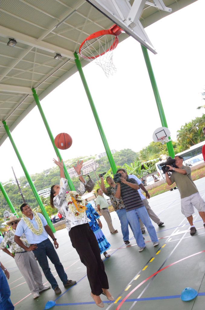 Décidémment très détendue au cours de cette troisième visite en Polynésie, la ministre de l'Outremer Marie-Luce Penchard a accepté de bonne grâce d'inaugurer le terrain de basket de la salle omnisport Manutahi de Punaauia. "J'ai fait du basket quand j'étais plus jeune" s'est amusée la ministre, qui a tenté de mettre la balle au panier à plusieurs reprises, mais sans succès.