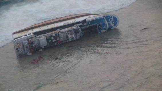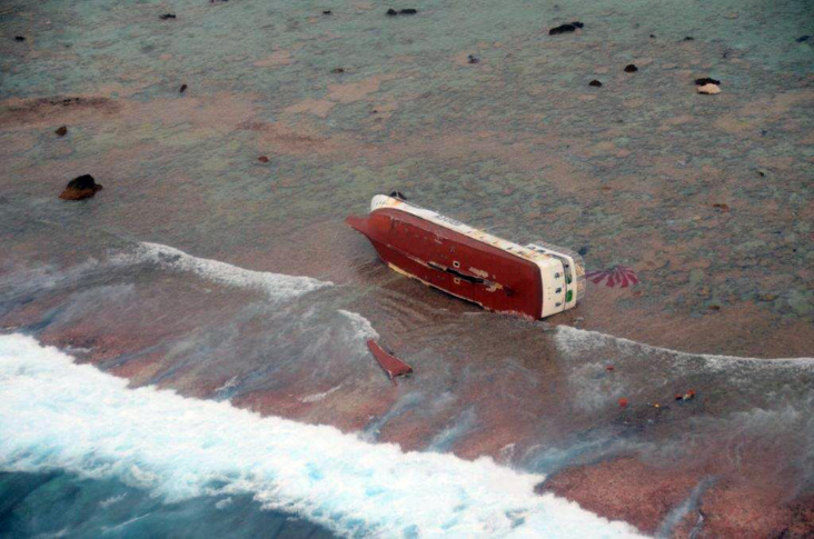 Depuis maintenant cinq semaines, l’épave du Sheng Long Yu n°21, gît sur le flanc, abandonnée sur le récif de Marutea Nord.