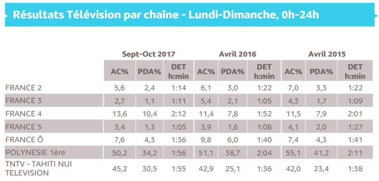La chaine de télévision Polynésie 1ère reste avec 50.2% d'audience cumulée (AC) la première chaîne de télévisons sur le territoire, mais perd au fil des mois de l'audience, puisqu'en avril 2016 son AC était de 51.1%. Parallèlement, sa concurrente TNTV poursuit sa hausse passant de 42.9% en avril 2016 à 45.2% aujourd'hui.
