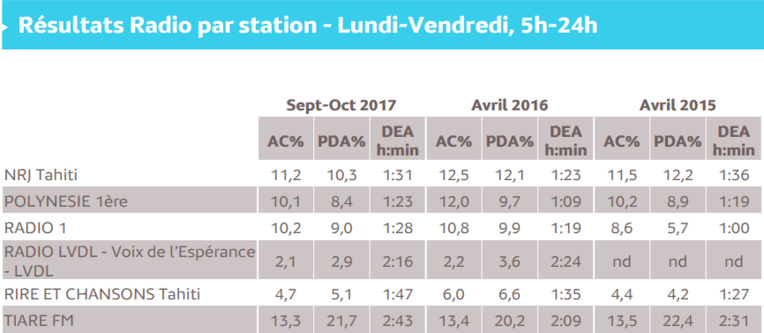En ce qui concerne les ondes, Tiare FM reste en tête avec 13.3% d'AC contre (13.4% en avril 2016). Ensuite, on peut noter un trio très serré comprenant NRJ Tahiti avec 11.2% d'AC, Radio 1 avec 10.2% d'AC et Polynésie 1ère avec 10.1% d'AC.