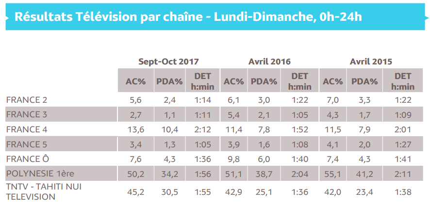 Médiamétrie et Alvea Consulting ont publié ce jeudi les résultats de l'enquête d'audience de la télévision et de la radio en Polynésie française.