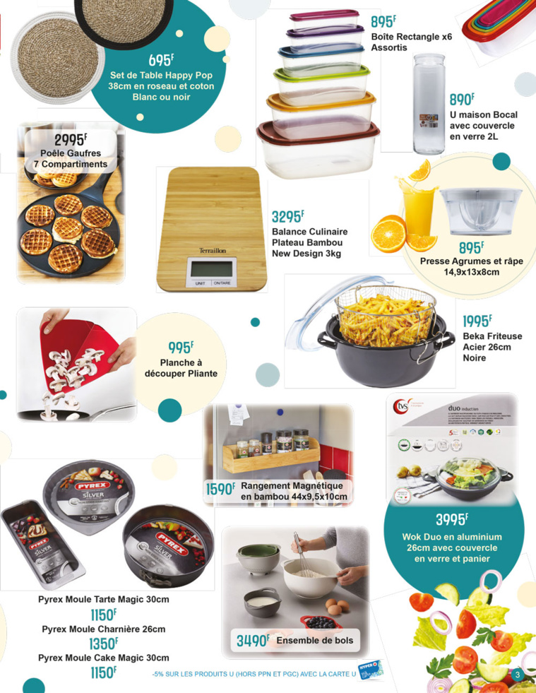 Pour la cuisine, de nombreux ustensiles vous aideront pour vos préparations culinaires comme un mini Four à 10990 F, une bouilloire à 5990 F, une machine à expresso à 11990 F un wok Duo en aluminium 26 cm avec couvercle en verre et panier à seulement 3995 F, des poêles à gaufres 7 compartiments, des balances culinaires, des friteuses, ou encore tout un assortiment de moules à tarte ou à cake de tailles différentes. Tout pour réaliser de délicieux repas en famille !