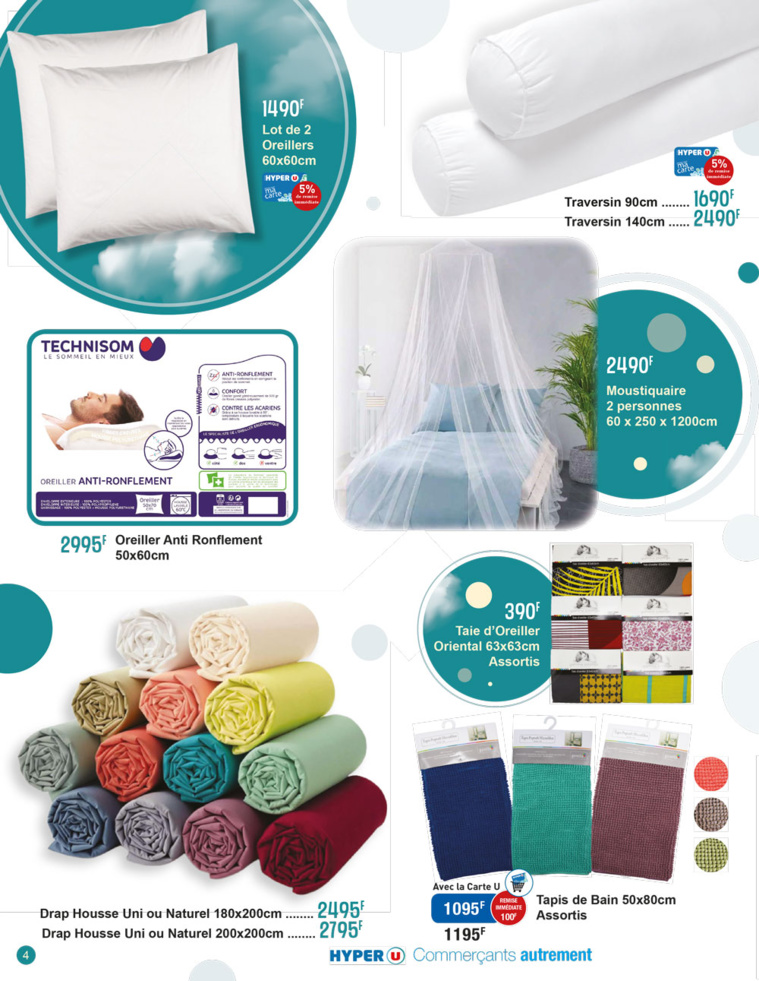Pour la chambre, un environnement de sommeil sain est indispensable pour un bon sommeil. Découvrez dans les promos de la quinzaine une variété de coussins, de nombreux plaids à 2290 F, des draps housse avec traversins et des taies d’oreiller, et même un coussin anti-ronflement à 2995 F.